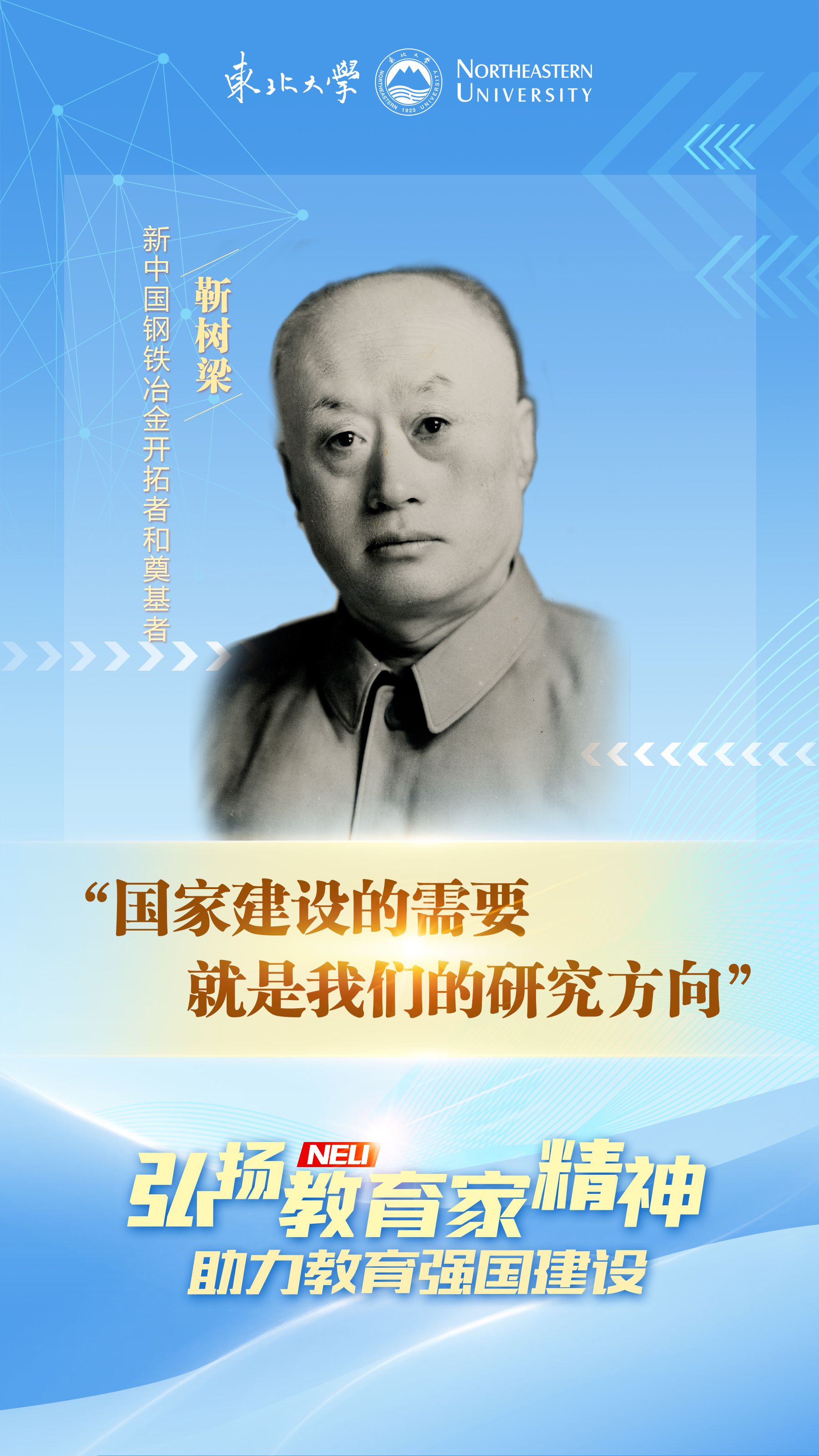 靳树梁以至诚报国、敢为人先的精神和智慧,在我国钢铁事业从弱到强的发展中开创了突破性的辉煌和成就,他先进教育理念和求真务实的治学态度凝练进东大人的精神文化谱系中代代传承。